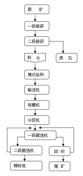 為了方便大家理解,先給大家看下使用的設備,以及每個階段使用的設備,也就是磁鐵礦選礦流程圖,圖例如下: